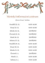 Od 24. do 27. prosince bude informační centrum zcela uzavřeno. Otevřeno bude i na Silvestra, ale pouze do 14 hodin. 1. ledna bude zavřeno a 2. ledna už se na Vás těšíme v běžné otevírací době.