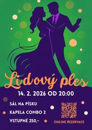Srdečně zveme na 76. ročník tradičního Lidového plesu, který se uskuteční ➡️ v sobotu 14. února od 20:00 hodin v sále Na Písku. K poslechu a tanci zahraje skvělá hudební skupina COMBO 2, součástí programu bude stylové předtančení v podání tanečního studia Mirror a soutěž o hodnotné ceny. Vstupné 250 Kč. Vstupenky je nutné rezervovat zde: https://lidovyples.rezervace.online/ Platbu lístků lze provést online, pokyny k platbě obdržíte v emailu po dokončení rezervace. Případné dotazy směřujte na: lidovyples@gmail.com