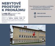 Město Moravské Budějovice nabízí k pronájmu nebytové prostory vhodné ke komerčnímu využití! 🔹 1. máje 123 (prostor č. 303) ➡️ 42,2 m² | 2 místnosti | přízemí Ideální pro kancelář nebo menší provozovnu. 🔹 Husova 189 (bývalý obchod ZEPO) ➡️ 318,93 m² | 4 místnosti + sociální zázemí | 2. patro Vhodné pro obchodní nebo kancelářské účely. 🔹 Purcnerova 60 (bývalý IBIS) ➡️ 380,29 m² | 19 místností | kancelářské prostory Pro větší podnikání nebo sídlo firmy. 🔹 nám. Míru 26 (podnikatelský inkubátor) ➡️ 55,6 m² | 4 místnosti (WC, chodba, sklad, kancelář) Skvělá poloha přímo v centru města! 📞 Kontakt: 568 420 039 📧 E-mail: mame@mamenet.cz Neváhejte a využijte příležitosti podnikat v srdci Moravských Budějovic!