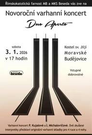 Zveme Vás na novoroční varhanní koncert Duo Aperto, který se uskuteční v sobotu 3. ledna 2026 od 17 hodin v kostele sv. Jiljí v Moravských Budějovicích. Na koncertě vystoupí zkušené interpretky Pavla Kujalová a Irena Michalovičová, které publiku představí originální varhanní skladby psané pro čtyři ruce a čtyři nohy.