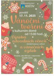 Zveme Vás na vánoční tvoření do kulturního domu v pondělí 17.11.2025 od 15:00 hodin.