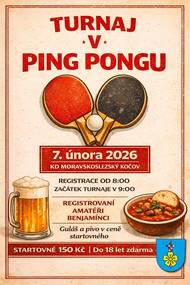 Srdečně Vás zveme na turnaj v ping pongu, který pořádá naše TJ Moravskoslezský Kočov v sobotu 7.2.2026 v kulturním domě.