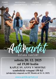 Zveme vás na koncert Antikvartetu Dušana Vančury, který se koná již tuto sobotu 20. prosince 2025 od 19:00 hodin v kapli sv. Anny v Mostku. Vstupenky jsou stále k dispozici v předprodeji na OÚ Mostek za pouhých 150 Kč.