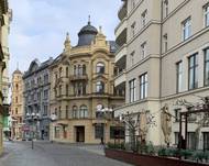 Aktuální fotografie rekonstrukce bývalého hotelu Centrum ve Frýdku-Místku. Jsou měněny fasádní výplně, probíhá realizace nové fasády a značná část prací probíhá v interiéru objektu.