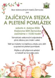 Srdečně vás zveme na Zajíčkovu stezku a pletení pomlázek, které se uskuteční v sobotu 4. dubna 2026 od 15:00 hodin v klubovně SDH Žernovka. Čeká vás příjemné tematické odpoledne plné zábavy pro malé i velké: 🐣 Zajíčkova stezka pro děti 🌿 společné pletení pomlázek 🌸 milá atmosféra a setkání se sousedy Přijďte si užít hezké odpoledne a naladit se na příchod jara a velikonočních svátků. Těšíme se na vás! 🌼