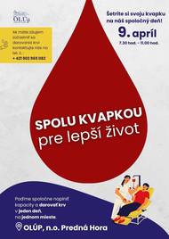 9.4.2026 od 7:30 - 11:00 OLUP Predná Hora. organizuje odber krvi. Odber bude v priestotoch OLUP Predná Hora nahlásiť sa môžete na tel čísle 0902 965 082 Ďakujeme