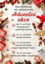 Obec Mydlovary srdečně zve na nadcházející adventní akce v obci. Dne 12. 12. od 16,00 Setkání seniorů a od 18,00 Koncert dětí ze ZŠ Zahájí v kapličce. 24. 12. bude od 14,00 k dispozici Betlémské světlo u kapličky.