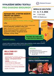 Obec Mydlovary ve spolupráci s Diakonií Broumov pořádá sbírku ve dnech 4. - 7. května 2026. Zabalené, čisté, suché ošacení či jiné zboží bude možné odevzdat na obecním úřadu.