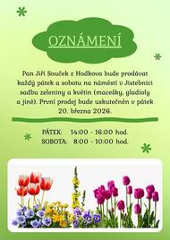 Pan Jiří Souček z Hodkova bude prodávat každý pátek (14.00 - 16.00 hod.) a sobotu (8.00 - 10.00 hod.) na náměstí v Jistebnici sadbu zeleniny a květin. První prodej se uskuteční v pátek 20. března 2026.