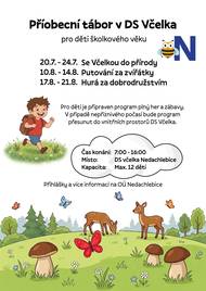 Příobecní tábor v DS Včelka pro děti školkového věku, jsou dány tři termíny a to 20.7.-24.7. Se Včelkou do přírody, 10.8.-14.8. Putování za zvířátky a 17.8.-21.8. Hurá za dobrodružstvím. Pro děti je připraven program plný her a zábavy. Přihlášky a více informací na OÚ Nedachlebice.