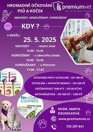 V Nehvizdech se bude konat romadné očkování domácích zvířat proti vzteklině a dalším infekčním nemocem. Očkování se uskuteční v neděli 25. května 2025 od 15:00 do 15:45 hod. před úřadem městyse.