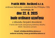 Ordinace MUDr. Horákové v Nehvizdech bude dne 22. srpna 2025 uzavřena z důvodu čerpání dovolené. V tento den bude zajištěna zastupující péče MUDr. Novotnou v Jirnech. Děkujeme za pochopení. MUDr. Horáková