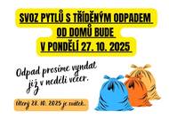 Upozorňujeme občany, že pytle s vytříděným odpadem budou svážet technické služby v pondělí 27. 10. 2025 místo úterý (28. 10. 2025 je svátek). Odpad prosíme vyndat již v neděli večer. Nadále pak platí svoz vždy v úterý a pátek.