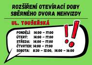 Od 1. září 2025 se rozšiřuje otevírací doba sběrného dvora v ul. Toušeňská, Nehvizdy: PONDĚLÍ 14:30-18:00 hod. STŘEDA 13:00-17:00 hod. SOBOTA 8:30-12:00 hod.