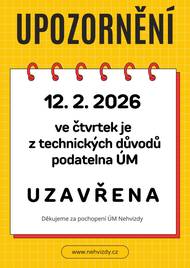 Oznamujeme, že z technických důvodů bude podatelna ÚM dne 12. 2. 2026 uzavřena, tzn. že v tento den nebudou dostupné služby CzechPOINT, vidimace a legalizace a ostatní platby na podatelně. Děkujeme za pochopení.