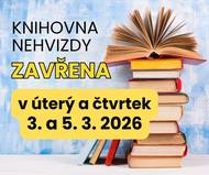 Vážení čtenáři, informujeme vás, že knihovna Nehvizdy bude uzavřena v úterý 3. března 2026 a ve čtvrtek 5. března 2026. Děkujeme za pochopení.