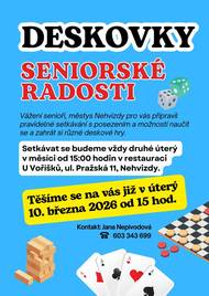 Vážení senioři, městys Nehvizdy pro vás připravil pravidelné setkávání s možností naučit se a zahrát si různé deskové hry. Setkávat se budeme vždy druhé úterý v měsíci od 15:00 hodin v restauraci U Voříšků, ul. Pražská 11, Nehvizdy.