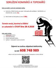 Sdružení kominíků a topenářů bude provádět v naší obci v úterý 28.4. požadované kontroly a čištění komínů pro plyn i tuhá paliva dle zákonu č. 34/2016 Sb. za následující ceny: Čištění komínů: 450 Kč, Revize kotlů na tuhá paliva: 1.300 Kč