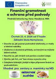 Obec Nemyčeves ve spolupráci s Otevřenými zahradami Jičínska zvou na přednášku o finanční gramotnosti a ochraně před podvody. Přednáška se uskuteční ve čtvrtek 23. dubna 2026 od 17.00 hodin v základní škole v Nemyčevsi. Podrobnosti najdete v příloze, tak přjďte, občerstvení je zajištěno 😊