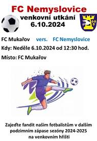 V neděli dne 6.10.2024 sehraje od 12:30 hod. tým FC Nemyslovice další venkovní zápas, tentokrát na hřišti FC Mukařov.