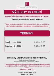 Výjezdy pracovníků finančního úřadu do Chlumce nad Cidlinou a Nového Bydžova v lednu 2026.