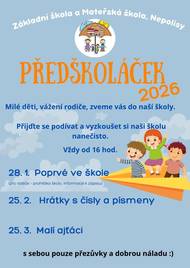 Srdečně vás zveme k nám do školy! Přijďte si prohlédnout naše třídy, poznat učitele a vyzkoušet si, jaké to u nás je. Čekají vás hravé aktivity a příjemná atmosféra. Těšíme se na vás.