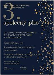 Obce Přelovice a Neratov vás srdečně zvou na 3. společný ples! Přijďte se pobavit, zatančit si a užít si skvělý večer se sousedy, kamarády, známými. 📅 Kdy: Pátek 30. ledna 2026 🕖 Čas: Od 19:00 hodin 📍 Kde: Společenský dům v Přelovicích 🎶 Hudba: K tanci a poslechu hraje kapela smartBand! 💰 Vstupné: 250,- Kč 🎟 Předprodej vstupenek na obecních úřadech: 📞 Přelovice: 606 752 571 📞 Neratov: 606 660 241 Těšit se můžete na bohaté občerstvení, bar a lákavou tombolu! 🎁🍷 Těšíme se na vás!