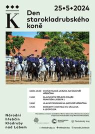 Den starokladrubského koně 2024, který se uskuteční v sobotu 25. dubna. K vidění bude mimo jiné velký kočárový rej, dámy v sedle a volné stádo klisen s hříbaty. Doprovodný program na nádvoří hřebčína začne již v 10:00 hodin půlhodinovou chovatelskou ukázkou starokladrubských koní. V 11:00 hodin očekáváme příjezd císaře Františka Josefa I., od jehož poslední návštěvy letos uplyne 150 let. Hlavní program na nádvoří kladrubského hřebčína začíná ve 13:00 hodin. Slavnostní den zakončí o půl šesté koncert v kostele sv. Václava a Leopolda. Celý program se ponese v duchu oslav 5 let od zápisu na Seznam světového dědictví, 30 let výroční od začátku spolupráce s dánskými královskými stájemi a 20 let od začátku spolupráce se Švédskou královskou jízdní gardou. Rozhodně se máte na co těšit, přijďte se podívat!