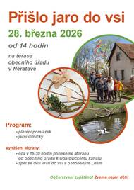 Přišlo jaro do vsi - 12. dubna 2025 od 14 hodin na terase obecního úřadu v Neratově Program: • pletení pomlázek • zdobení vajíček • dílničky • vyfouknutá vajíčka s sebou! Vynášení Morany: • cca v 15.30 hodin poneseme Moranu od obecního úřadu k Opatovickému kanálu • zpět se děti vrátí do vsi s ozdobeným Lítem Občerstvení zajištěno! Zveme nejen děti!
