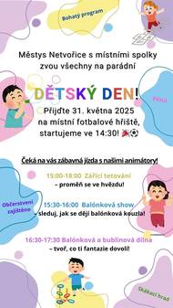 ve spolupráci s místními spolky vás srdečně zve na pálení čarodějnic na fotbalovém hřišti. Od 17:00 hodin začíná pro děti zábavné odpoledne s překvapením. Pro ostatní začíná program od 19:00 hodin. Po setmění zapálíme hranici a společně si opečeme buřty. V 18:00 hodin se můžete zúčastnit tradičního stavění májky na náměstí. Odkaz https://www.netvorice.cz/aktuality/paleni-carodejnic4