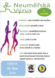 Obec Neuměř a BKV Holýšov zvou na běžecký závod Neuměřská Výzva, který se bude konat v sobotu 26.10.2024. Společně si můžeme užít tratě 12 km a 3,4 km. Start bude ve 14 hodin před Neuměřskou hospodou.