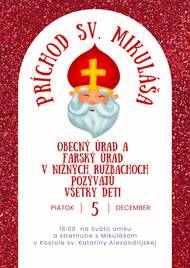 Obecný úrad a Farský úrad v Nižných Ružbachoch pozývajú všetky deti na Svätú omšu a stretnutie s Mikulášom, ktoré sa uskutoční 5. decembra 2025 o 18:00 v Kostole sv. Kataríny Alexandrijskej.