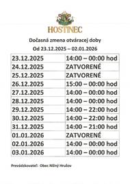 Hostinec Nižný Hrušov má dočasne upravené otváracie hodiny od 23.12.2025 do 2.1.2026. Detail otváracích hodín nájdete v prílohe oznamu.