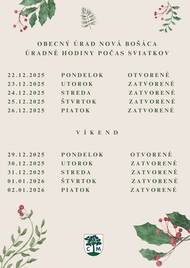 Obecný úrad Nová Bošáca počas sviatkov: 22.12.2025 otvorené, 23.12.2025 zatvorené, 29.12.2025 otvorené, 30.12.2025 - 4.1.2026 zatvorené. PF2026🍾🍾🍾