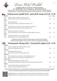 Před 20 dnyLesní Hotel Peršlák - Týdenní menuVážení hosté, v sobotu 14.02.26 je svátek sv. Valentýna, svátek všech zamilovaných. To je všeobecně známé, neboť nás na to upozorňují mnohé reklamy. Málo je ale zmiňováno, že je tento den také Světovým dnem léčby zvukem. Možná si mnozí představí oslavu tohoto dne krásnou hudbou, avšak příznivci této metody uzdravování se v tento den schází a společně vydávají libé zvuky. Takto vyvolaná rezonance prý zlepší fyzickou i duševní pohodu nejen jejich ale i ostatních. V tento den ale probíhá na mnoha místech i tradiční maškarní masopustní průvody. Kam v okolí vyrazit za touto lidovou zábavou ale i další tipy na kulturní a jiné akce naleznete na našich webových stránkách zde: https://www.perslak.com/kalendar-akci.html Protože kapacita naší zahrádky i restaurace je omezená, prosíme Vás o včasnou rezervaci na telefonním čísle: 384 386 505. Pro školáky a studenty z Nové Bystřice a širokého okolí i letos, hlavně o víkendech, ale i o prázdninách, nabízíme možnost brigády v restauraci nebo hotelu formou DPP. Minimální hodinové ohodnocení je u nás na Peršláku 180,-- a stravování je během směny zdarma. Rádi v našem kolektivu přivítáme spolehlivé a angažované lidi, které baví gastronomie a práce s lidmi. Již nestudujete, ale rádi byste si při Vaší současné práci přivydělali prací v gastronomií? Taky nás neváhejte kontaktovat, rádi Vás poznáme. PS: Naše restaurace je pro Vás otevřená 7 dní v týdnu, vždy od 11:30. Samozřejmě si můžete po celý den objednat z našeho stálého jídelního lístku. Těšíme se na Vaši návštěvu. S pozdravem a úctou, Marcus O. Hauser