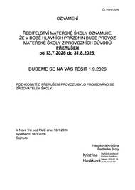 Pošta: Ve středu 14.1.2026 bude zavřeno, ostatní dny dle běžné otevírací doby. MUDr. Plačková: 19.-21.1. neprovádí odběry, 22.-23.1. neordinuje. Zástup MUDr. Hlaváčková, Nečín 115, tel. 318 588 220