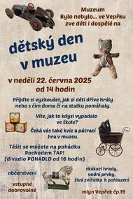Zveme nejen děti na nedělní odpoledne do muzea Bylo nebylo... ve mlýně ve Vepřku (od 14 hod.). Pro děti je připravena detektivní hra, stanoviště s aktivitami (výroba vlastního erbu, archeologie atd.), živá zvířátka k pohlazení z JS Harley Forever, skákací hrad, vodní osvěžení. Od 16 hodin nás čeká divadýlko Pochodem ŤAP! Dostatek stínu zajištěn, občerstvení také bude: točené pivo, limo, hranolky, párky v rohlíku, nanuky. Tak se stavte, vstup zdarma!