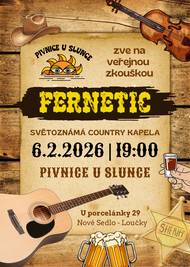 Pivnice U Slunce zve na veřejnou zkoušku country kapely Fernetic. Setkání se uskuteční 6.2. od 19:00 hodin v pivnici. V příspěvku také plakát.
