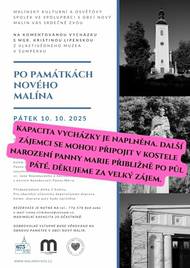 Při příležitosti oslav 675 let od první písemné zmínky o založení naší obce proběhne 10. října 2025 komentovaná vycházka s Mgr. Kristinou Lipenskou PO PAMÁTKÁCH NOVÉHO MALÍNA. Zahájení vycházky v 15:30 u sousoší Kalvárie (za bývalou karosárnou). Rezervace je nutná z důvodu omezené kapacity. Bližší informace jsou uvedeny v pozvánce