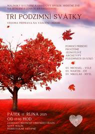 V pátek 17.10.2025 proběhne další setkání s Lenkou Krahulcovou, tentokrát na téma tří podzimních svátků - sv. Michaela, sv. Martina a sv. Mikuláše. Pomocí příběhů se seznámíme s jejich významem. Setkání proběhne v pátek 17.10. od 17 hod v zasedací místnosti Obecního úřadu Nový Malín. Pořadatel: Malínský kulturní a osvětový spolek
