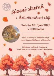 Spolek Malínské aleje srdečně zve na tradiční sázení stromů v třešňové aleji. Akce se koná v sobotu 18. října 2025 od 9,30 hodin. Sraz u závory uprostřed aleje. Akce je vhodná i pro rodiny s dětmi. Přijďte si zasadit strom a zapojit se do údržby a úklidu unikátního stromořadí.