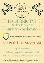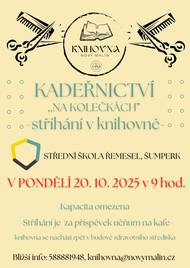 V pondělí 20. 10. 2025 od 9h. v knihovně- KADEŘNICTVÍ NA KOLEČKÁCH. Neváhejte a přijďte se ,,přistřihnout" :-)