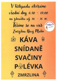 Vážení příznivci Zmrzlinárny Nový Malín, zveme vás na ranní a dopolední občerstvení, které pro vás nově otevíráme v našem stánku. Zkušební provoz zahájíme už ve čtvrtek 29. října. Od listopadu si u nás pak můžete dát ranní kávu, koláček, plněnou housku, svačinkovou polévku nebo zmrzlinu každý všední den od 6:30 do 13:00 hod. Těšíme se na vás!