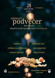 Spolek Malínské aleje zve na oříškový podvečer, který se bude konat v pátek 21. listopadu 2025 v 17 hodin v knihovně v Novém Malíně. Přijďte si užít tvoření, zábavné hry, oříškovou vědárnu, voňavé pečení, ochutnávání a objevování.