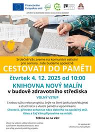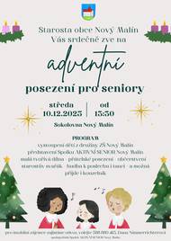 Starosta obce Nový Malín srdečně zve seniory z Nového Malína a Mladoňova na již tradiční adventní posezení pro seniory. Příjemné posezení s občerstvením doplní bohatý kulturní program. Pro informace, případně zajistění odvozu, prosím kontaktujte Danu Nimmerrichterovou na tel 588 880 415 nebo nimmerrichterova@novymalin.cz