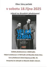 Obec Sány pořádá zájezd na divadelní představení "Velká zebra aneb jak že se to jmenujete?" v sobotu 18. října 2025. Cena 300 Kč zahrnuje dopravu a vstupenku. Odjezd autobusu je naplánován na 17:00 od Obecního úřadu.