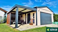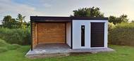 Zahradní domek s přístřeškem o rozměrech 3 x 6 m. Přístřešek je doplněn o stylové dřevěné lamely. Postaveno za 1 den. Bez těžké techniky. Výstavba je šetrná vůči okolí. Nedochází k narušení okrasných zahrad.