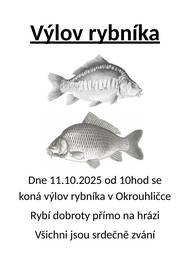 Upozorňujeme na výlov v Okrouhličce dne 11.10.2025 od 10:00 hod. Všichni jsou srdečně zváni.