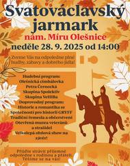 Firma Tlapka bude zítra od 8:30 na náměstí prodávat ovoce, zeleninu a burčák. Římskokatolická farnost Olešnice zve srdečně všechny občany na koncert Pavla Helana při příležitosti 300 let od vysvěcení hřbitovního kostela sv. Mikuláše. Koncert se koná 27. září od 17 hodin ve hřbitovním kostele. Vstupné je dobrovolné. Přijměte pozvání na svatováclavský jarmark, který se uskuteční v neděli 28. září od 14:00 s bohatým doprovodným programem. Zahrají nám Olešnická cimbálovka, Petra Čenocká, skupina Spolektiv a skupina VeHiBa, dále zde bude něco málo z historie a celý program bude zakončen ohňovou show. Všichni jste srdečně zváni.