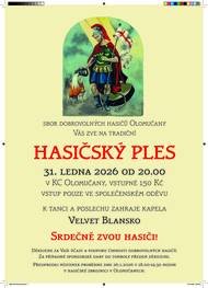 SDH Olomučany Vás srdečně zve na tradiční hasičský ples 31.1.2026 od 20.00 v KC Olomučany. Předprodej místenek proběhne 26.1.2026 v 18.00 -19.30 v hasičské zbrojnici v Olomučanech. Předtančení - olomučanští stárci a sourozenci Palowští, děkujeme. Těšíme se na Vaši návštěvu, Vaši hasiči
